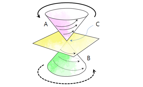 위 그림처럼 어느 한 점[위 그림 C, 태극太極]을 중심으로 서로 반대방향으로 나선운동을 하는 모습은 아래와 같이 생각해 볼 수 있습니다.