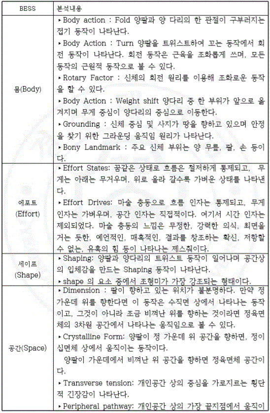 또한 몸짓 분석에 있어 사지와 몸통을 확장시키는 동작이며 완벽한 비대칭 동작으로 위, 아래, 앞, 뒤 등 사방팔방으로 신체가 각 부위에 공간성이 나타나 사지가 향하는 공간에 대하여 공간적 의지가 표출되며, 매우 역동적인 면도 요가에서의 분석 결과와 서로 동일하다.