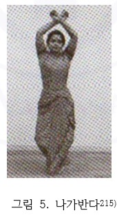 먼저 창조를 대표하는 몸짓언어는 나가반다이다. 이 몸짓언어는 그림 5.에서와 같이 정면을 본 상태로 양 발을 교차하여 앞, 뒤로 놓고 머리 위에서 양 손을 교차하여 인도 전통의 하스딱무드라인 나가반다 형상을 띄고 있다. 이러한 나가반다는 전술한 무용의 구성 원리에서 살펴 본 바와 같이 시바와 파르바티(환생한 샥티)의 춤 성격 탄다바와 라시야 중에서 부드러움과 창조에 해당하는 파르바티의 춤, 라시야의 몸짓언어라 볼 수 있다.