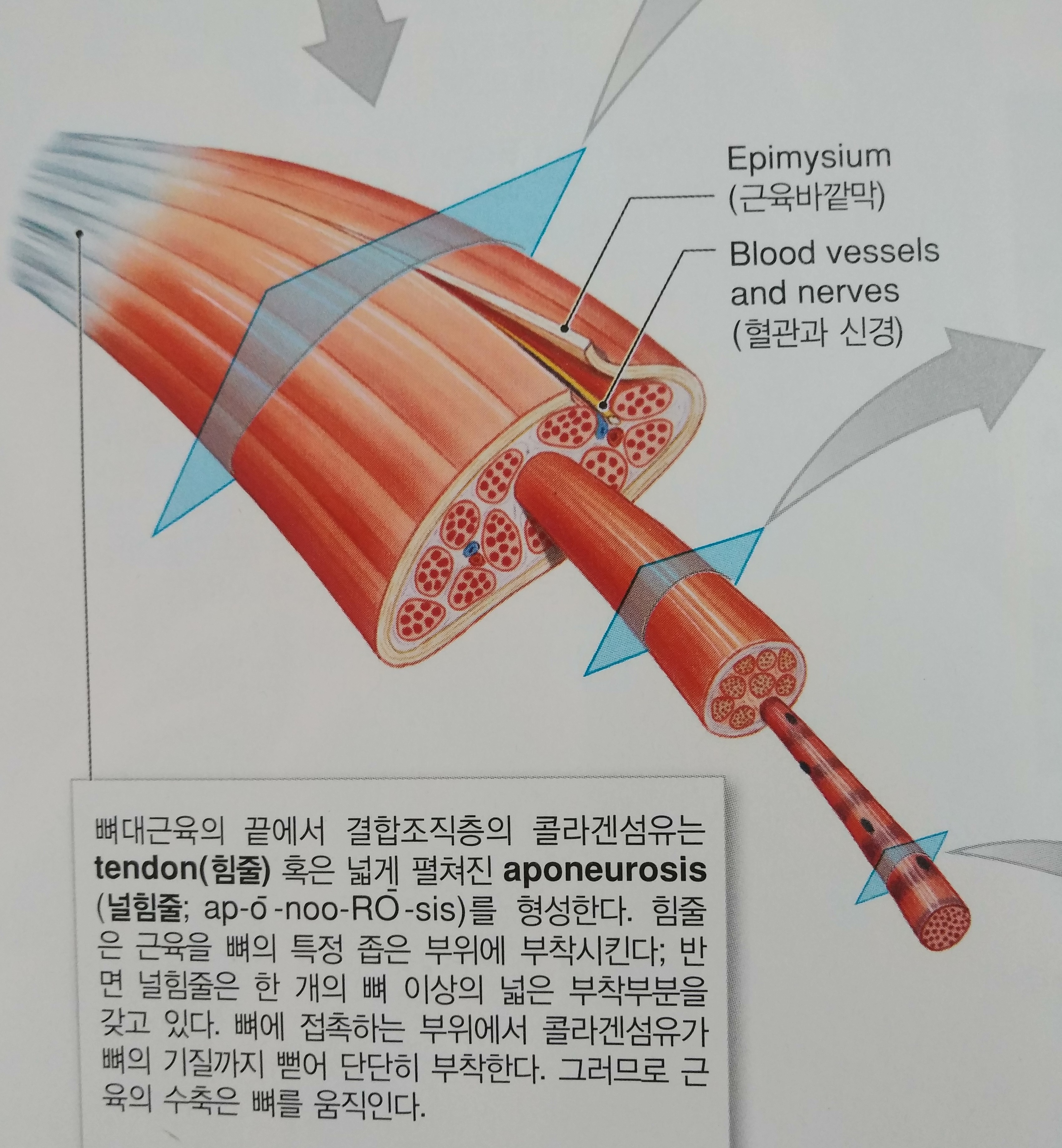 근섬유들이 근막에 둘러쌓여 있는 것들을 크게 확대해보면 근섬유 가닥가닥 하나하나가 근막으로 쌓여 있으면서 근 다발을 이루고 있고, 또 그것을 다시 근막이 싸고 있고 조그마한 근다발들이 또 여러 개가 모여 있는 것을 다시 또 근막이 싸고 있고 그렇게 싸고 있는 근막들이 모여 들어서 건이라는 형태가 되어 뼈대에 붙고 빨간 근섬유들이 수축을 하게 되면 그 힘을 뼈대까지 전달하게 되는 것이다.