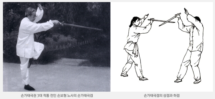 손가태극검은 손록당 선생이 만년에 제정한 검술로, 형의권/팔괘권/태극권을 깊이 연마하여 하나로 녹여내고 각파 검술의 장점을 두루 취하고 태극음양, 동정(動靜)의 체(體)에 입각하여 창제한 검법입니다. 손가태극검의 투로는 동정이 분명하고 가라앉고 안정됨과 가볍고 영활함을 겸비하고 있으며 세(勢)가 멈추어도 경(勁)과 의(意)는 끊어지지 않습니다. 손가태극검은 상검(上劍)과 하검(下劍)으로 나눌 수 있어서 혼자 수련하여도 되고 두 사람이 마주 수련하는 대검(對劍)으로 수련할 수 있는 특징이 있습니다. 이 대검 형식은 손가태극검만의 독특한 특징으로 상대의 검에 응하여 거리, 보법, 속도, 검의 정확성, 협동성 등을 연마할 수 있는 큰 장점을 지니고 있습니다