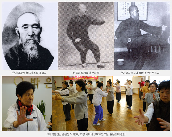 손가태극권은 당대 최고수로 칭송받던 손록당 선생의 내가삼권(內家三拳 - 형의권ㆍ팔괘장ㆍ태극권)에 대한 필생의 공부가 녹아있는 태극권입니다. 태극권사에 있어 가장 후대의 태극권으로 태극권 수련의 방법론과 이론의 체계성을 갖추어 권학(拳學)을 완성시켰습니다. 손가태극권은 활보개합태극권(活步開合太極拳)이라는 별칭에 맞게 보법의 영활성이 극에 이른 태극권으로 뒷발이 따라붙는 보법인 < 근보 >를 활용한 연속적인 공력의 발출을 특징으로 삼고 있습니다. 이에 따라 투로의 구성이 내공을 손으로 드러내어 실용적으로 사용하는 데 중점을 두고 있습니다. 동작이 간단하고 기감이 좋아 수련 효과가 빠르고 초보자도 어렵지 않게 배울 수 있는 태극권이지만 내공법의 단련으로 들어오면 내공법의 정수를 보여주는 매우 수준 높은 상승의 태극권입니다.