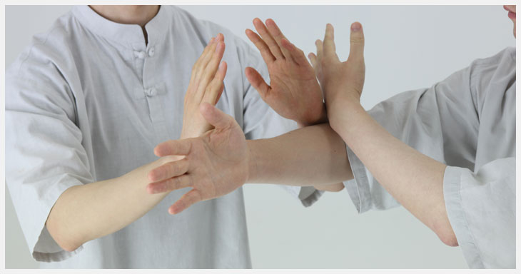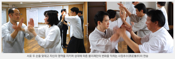 태극권의 초식을 적용하여 상호간의 손발의 교차 감각과 공간감각을 익힌다.