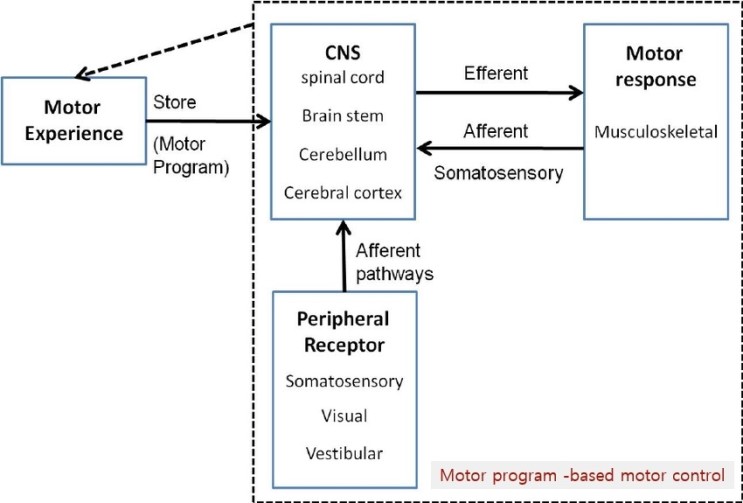 Keele(1968)은 운동프로그램에 대하여 "움직임의 순서가 시작되기 전에 이미 형성되어 있으며, 말초로부터 피드백feedbak을 받지 않는 상태에서 움직임의 순서전체가 수행되도록 해주는 일련의 근육명령들"이라고 정의하였다. 운동프로그램이 존재한다는 증거로는 빠른 움직임ballistic movement을 하는 동안에는 사람들이 되먹임을 사용할 수 없다는 점과 구심성 신경이 제거된 동물deafferented animals이 여전히 걸을 수 있으며, 계단을 오르고, 물건을 꽉 잡을 수 있다는 연구보고(Taub & Berm, 1968)와 중추패턴발생기central pattern generator가 존재한다는 데 있다. 그러나 구심성 신경이 절단된 동물은 물건을 세밀하게 조작하는 능력이 떨어졌고 또 연구과정에서 가능한 피드백 모두가 완전히 제거되었는지는 불확실하다. 더구나 빠른 움직임을 하는 동안에는 피드백의 영향을 안 받을 것으로 생각하고 연구를 진행하였으나 원래 생각했던 것보다도 짧은 시간 안에 피드백이 이용될 수 있다는 증거도 있다(Evarts & Tanji, 1976).