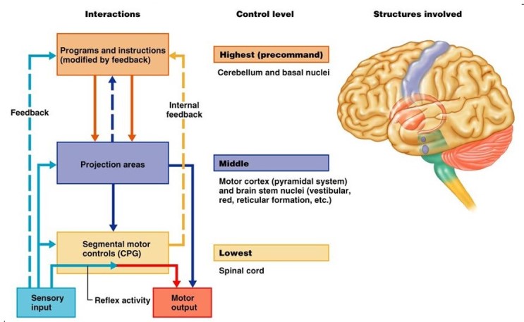 일반적으로는 계층적 이론에서는 하향식top-down의 조직적 구조로 되어 있다. 고위중추에서는 조절된 행동controlled behavior의 상세한 부분까지 관여하면서 하위중추를 제어한다. 만약 고위중추에서 하위중추에 대한 조절능력이 상실되면 원시반사가 나타나고 정상적인 발달과정이 차단된다.