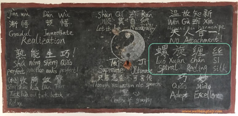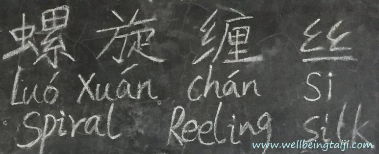 진소성 노사께서 칠판에 써 놓으신 딘어는 '螺旋缠丝[luóxuánchánsī], Spiral Reeling Silk'. 해석하자면 '나선형태로 감아도는 경(劲)'.