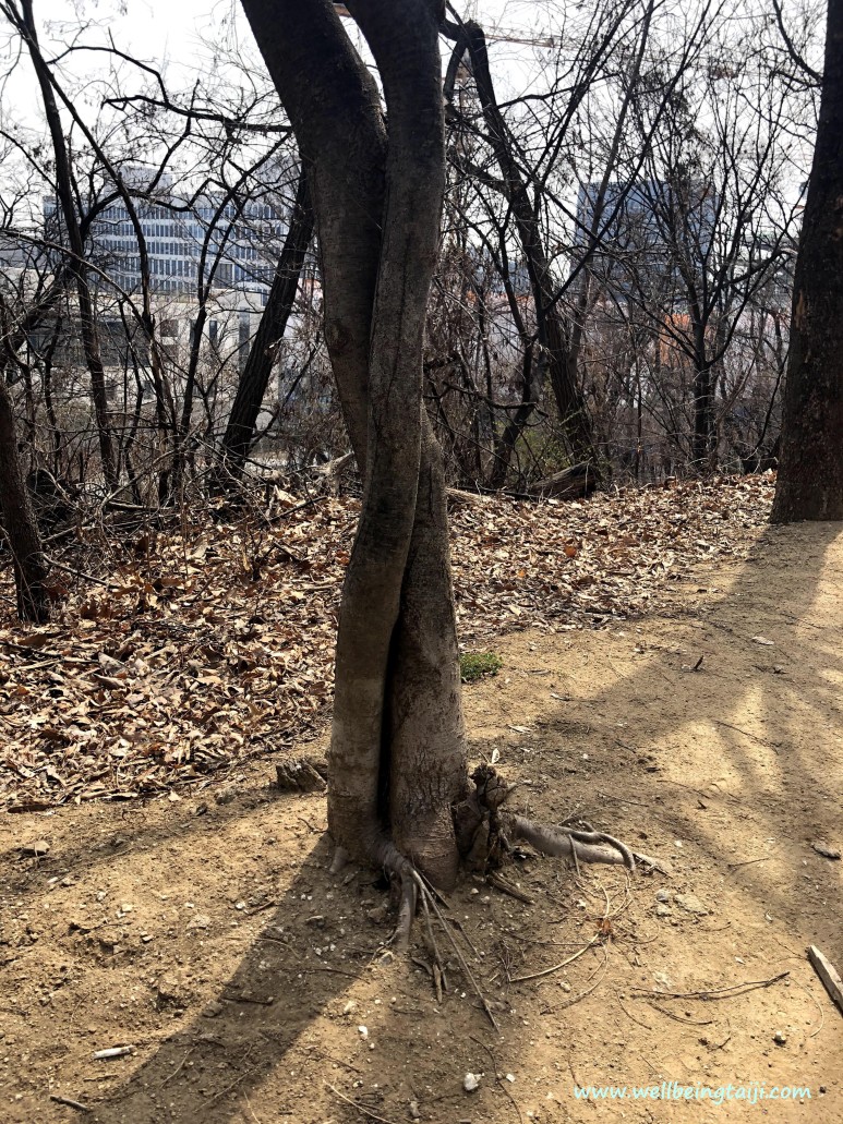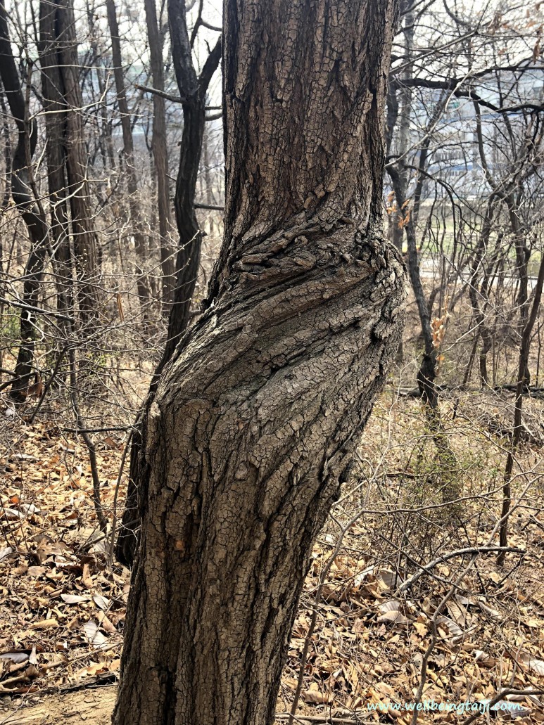 무릅이 다리 가랑이 안쪽으로 연결해서 안에서 바깥쪽 사선으로 감아돌며 내려간다.