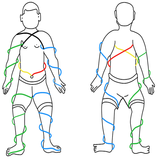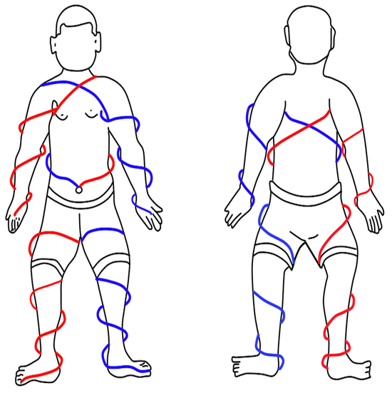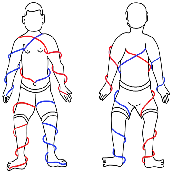 좌회선(S-twist)된 왼쪽 발에서 시작된 전사가 위[上]로 올라가 배꼽부위[단전]를 경유하여 체간에서 우회선(Z-twist)되어 오른쪽 겨드랑이에서 2개로 나뉘어