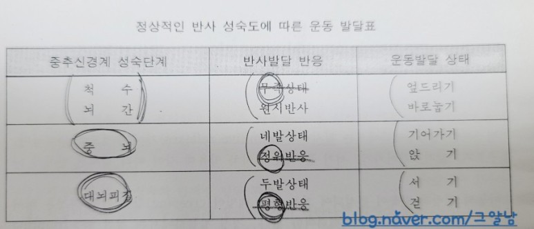 중추 신경계 반사 성숙도를 척수(spinal), 뇌간(brain steam), 중뇌(mid brain), 대뇌피질(cortical)의 운동발