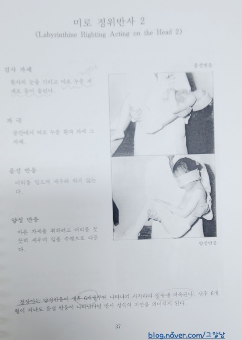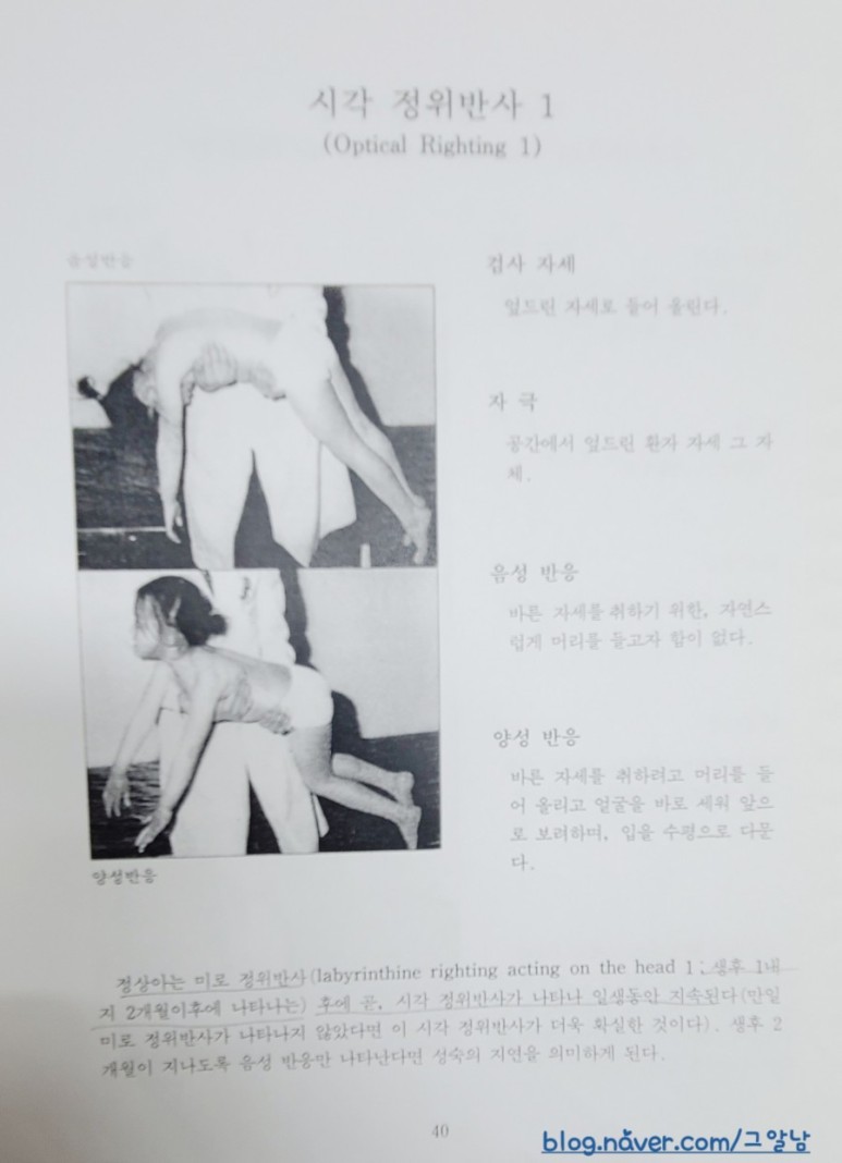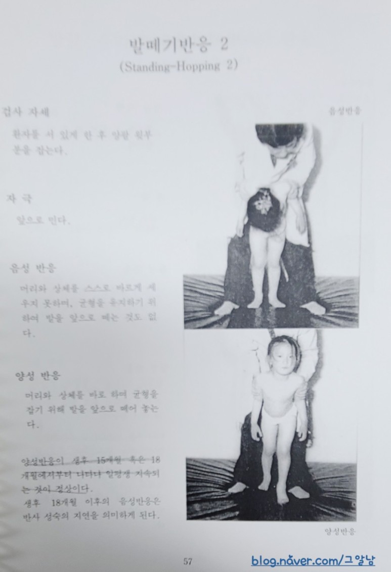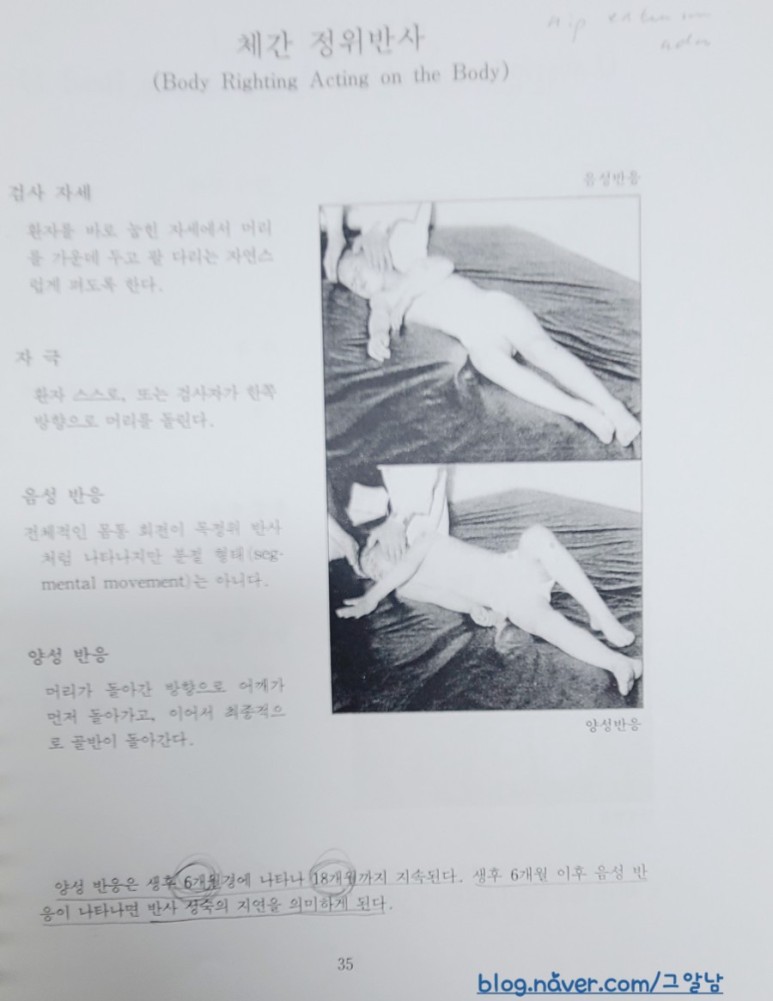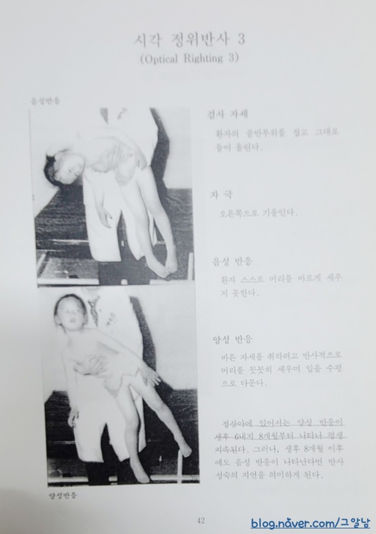 정상 발육하에서는 정위반사(righting reactions)과 평행반응(equilibrium reactions)같은