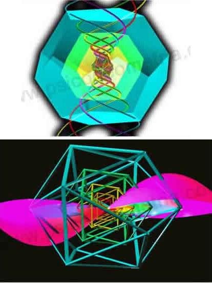 In the picture below is a fractal of an animated dodecahedron. The Diseño Natural Armónico molecule has dodecahedral symmetry since it naturally incorporates the golden ratio due to because of having 12 pentagons. This allows swallowing or compressing waves from the exterior to the interior. The dodecahedron symmetry, when imbricated in a reticule or net in the planet, conjugates with the dodecahedron represented by the 12 houses of the Zodiac. A fractal that enables the heterodynamic conjunction of waves, i.e. the resonance of forms for communication in different reality levels.
