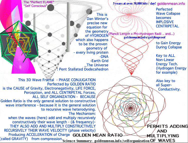 오직 황금 분할 대칭의 형태만이 수렴하는 파동이 동시에 더하고 곱하는 것을 허용한다. 이런 방식으로만, 파동은 다른 것을 간섭하거나 그것들의 기억을 지우는 일이 없이 둥우리를 만들 수 있다. 황금 나선은 삼각형, 사각형 및 오각형을 중첩해서 12면체를 만들 수 있다. 12면체는 황금비율(Φ)을 사용하기 위해 고유한 구조로 정보를 변경하는 완벽한 황금비율 공학(perfect nesting golden reason)이다. 이러한 원리가 그것이 또한 나선형으로 중첩된 DNA 분자의 후원자이기도 한 까닭이다. 황금비율이 발생하면 도넛형 정20면체와 정12면체가 자연스럽게 다른 두 숫자인 상수 파이(π)와 오일러(e)를 생성한다.