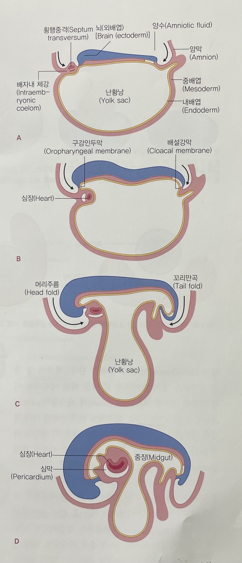 이런 체강들은 나중에 흉부와 복부의 근막 자루를 형성하고,체강의 맨 윗부분은 시상면으로 접혀서 얼굴 바로 앞을 지나 발육중인 심장을 에워싸는 이중자루인 심장내막뿐 아니라 횡경막의 중심 부위가 된다.
