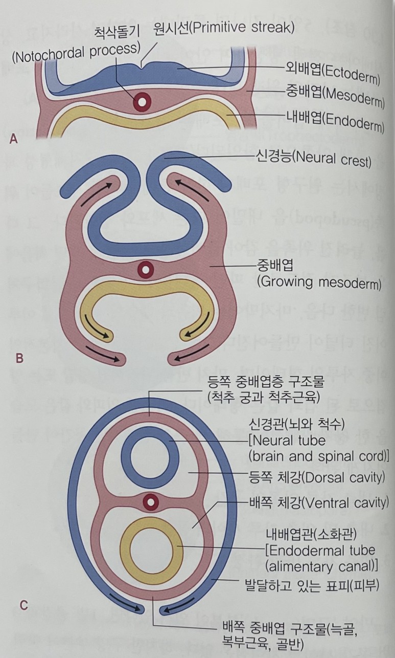 중간층인 중배엽을 자세히 보면 후에 척추가 되며,척삭으로 불리는 원시선 부분 아래의 중간 부위가 두꺼워 진 것을 확인할 수 있다.