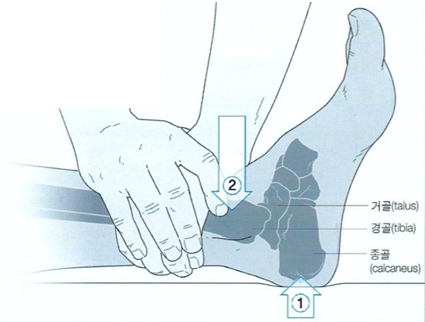 - 검사자의 한 손은 내과(경골 원위부) 또 다른 한 손은 외과(비골 원위부)를 접촉한다