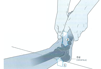 - 검사자의 안쪽 손은 종골 근위부를 접촉하고 다른 한 손은 발가락을 전체적으로 감싼다.
