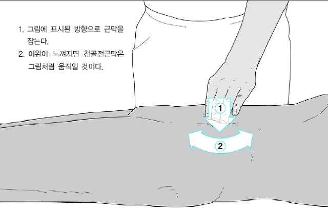 - 환자로 하여금 제한 및 통증이 있던 방향으로 능동적 운동을 2~3회 시킨다. 긍정적인 반응이 있다면 6회씩 2번 반복한다.