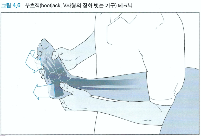 - 검사자는 종골을 하방으로 견인하고 발가락은 족저굴곡 한 다음 거퇴관절의 간격이 늘어나도록 저항한 다음 이완이 될 때까지 유지한다.