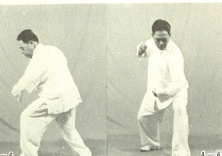 ② 무릎을 굽혀 몸을 낮추고 숨(氣息)을 가라앉히고 몸이 약간 우측을 보게 한다. 왼쪽 주먹을 계속 앞으로 뻗치고 오른팔을 약간 굽힌 채 주먹을 오른쪽 허리까지 올린다. 눈은 왼쪽 주먹을 본다.