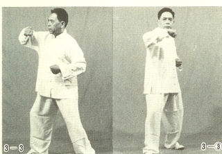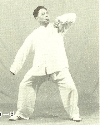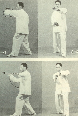 ① 오른다리를 앞으로 내고 몸을 약간 좌로 돌린다. 오른팔을 약간 굽히고 외선 시킨다. 오른손은 주먹을 쥐고 앞으로 올린다. 이때 권심은 비스듬히 위를 보게 한다. 왼손은 주먹을 쥐고 약간 뒤로 거두고 눈은 오른쪽 주먹을 본다.