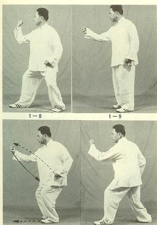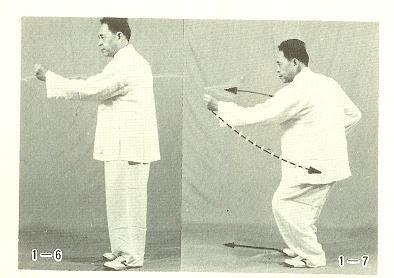 ① 무극기식을 한 다음, 왼다리를 앞으로 내고 몸을 약간 우로 돌린다. 왼팔을 약간 굽히고 외선(外旋)시킨다. 왼손은 주먹을 쥐고 앞으로 돌린다. 이때 권심(拳心)은 비스듬히 위를 보게 한다. 오른손은 주먹을 쥐고 약간 뒤로 거두고 눈은 왼쪽 주먹을 본다.