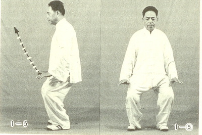 ④ 무릎을 계속 굽히면서 몸의 중심을 낮추며 손이 양다리 바깥 측면을 밑으로 누르는 기분으로 내린다. 중심을 내리게 할 때 허리에 힘을 줘서는 안되며 사타구니를 U자 형으로 만들며 바깥쪽으로 펴는 기분으로 벌리고 내기(內氣)를 단전에 가라앉힌다. 잠시 조용히 서있다가 팔목의 힘을 빼고 손가락이 지면을 보게 해서 내려뜨린다.