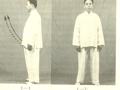 ① 무극기식을 한 다음, 왼다리를 앞으로 내고 몸을 오른쪽으로 돌리고 왼팔을 약간 외선(外旋) 시키면서 왼손을 천천히 앞으로 올린다. 오른손은 주먹을 쥐고 약간 뒤로 거두며, 눈은 왼손을 본다.