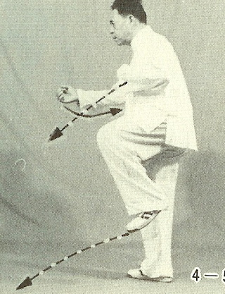 ② 몸무게를 앞다리로 옮기고 몸을 약간 좌로 돌리며 오른다리를 굽혀서 들어올린다. 이때 오른다리는 자연스럽게 왼다리 정강이 우측에 오게 하고 발끝을 밑을 보게 해서 늘어뜨린다. 오른팔은 팔꿈치를 굽혀 약간 내선시키고 오른쪽 주먹은 옆구리를 거쳐 가슴 밑에 와서 (권안을 위를 보게 해서) 멈추고, 동시에 왼손은 주먹을 쥐어 배 앞에 내린다. 눈은 전하방(前下方)을 본다.