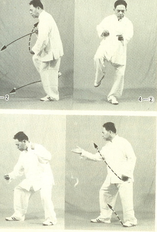 ② 오른쪽다리는 무릎을 굽혀 앞에 궁보(弓步)를 만들고 상체를 우로 돌리고 앞으로(약간) 기울게 한다. 오른팔을 내선 시키며 팔꿈치를 굽힌다. 오른쪽주먹은 왼쪽으로 돌려서 가슴 앞에 거둔다(扣). 권안은 안쪽을 보게 한다. 왼팔을 내선 시키고 팔꿈치를 약간 굽혀 우전방으로 호(弧)를 그리며 팔을 비틀면서 밑으로 내린다. 왼쪽주먹의 권안을 안쪽으로 보게 하고 권심은 왼쪽을 보게 한다. 눈은 전하방을 본다.