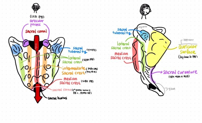 - lateral sacral crest / 외측천골능 / 가쪽엉치뼈능선 : 엉치뼈의 가로돌기가 유합되어 만들어짐