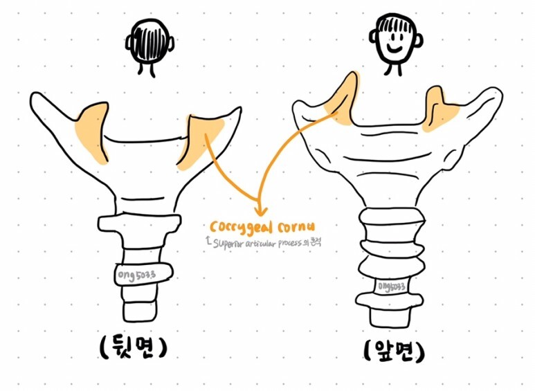 - coccygeal cornu / 미골각 / 꼬리뼈뿔 : 1st 꼬리뼈의 superior articular process / 상관절돌기 / 위관절돌기의 흔적
