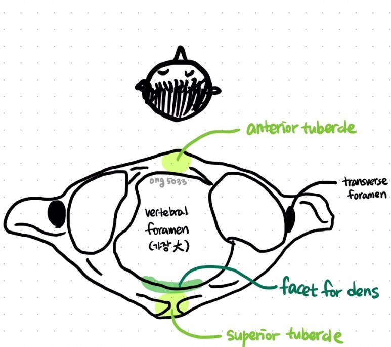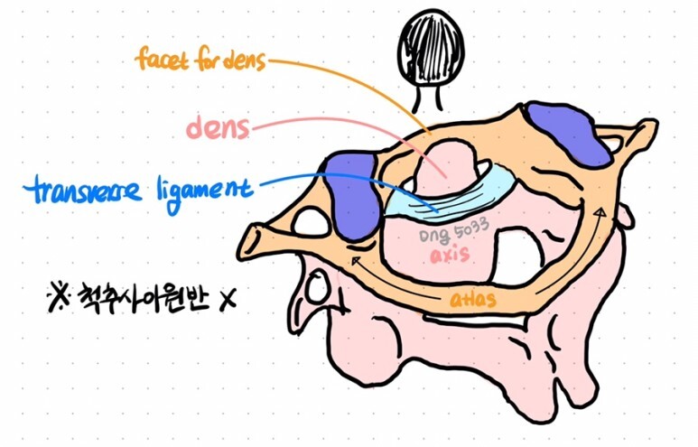 → 치아돌기는 앞고리(atlas)와 고리뼈가로인대(transverse lig. of atlas)와 관절하여 회전운동의 축을 이룬다.