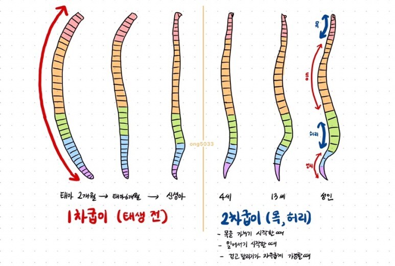 ③ lumbar curvature / 요추만곡 / 허리굽이 ← secondary curvature / 이차만곡 / 이차굽이