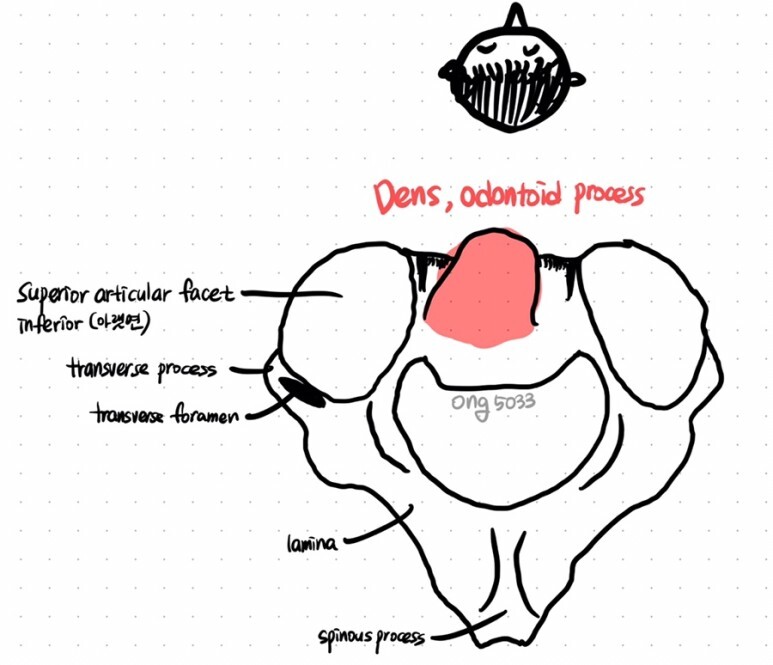 - dens, odontoid process/ 치돌기 / 치아돌기 : 발생 중 고리뼈(C1)의 척추뼈몸통이 분리되어 중쇠뼈(C2)의 몸통에 유합되어 형성