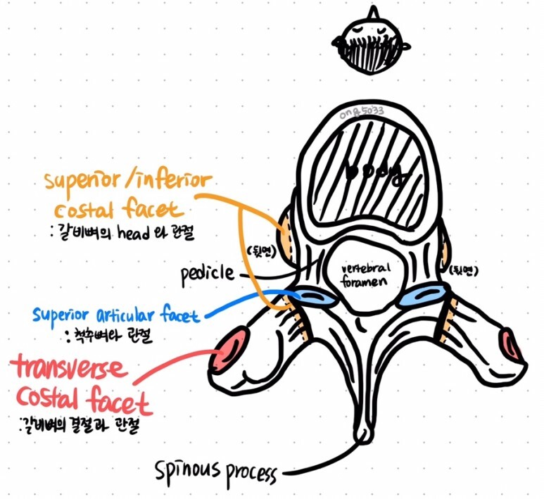 - superior costal facet / 상늑골와 / 위갈비오목 & inferior costal facet / 하늑골와 / 아래갈비오목 <T1~T8>