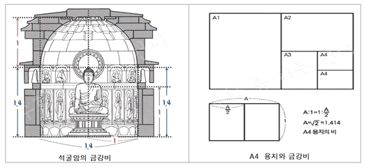 우리나라에서 가장 아름다운 건축물로 인정받는 부석사 무량수전에도 금강비가 담겨있는데요. 무량수전의 밑바닥의 가로와 세로가 금강비를 이루고 지붕과 높이 역시 금강비를 이룹니다. 석굴암은 금강비로 만들어진 대표적인 건축물입니다. 석굴암의 구조를 보면 다양한 금강비가 존재합니다.