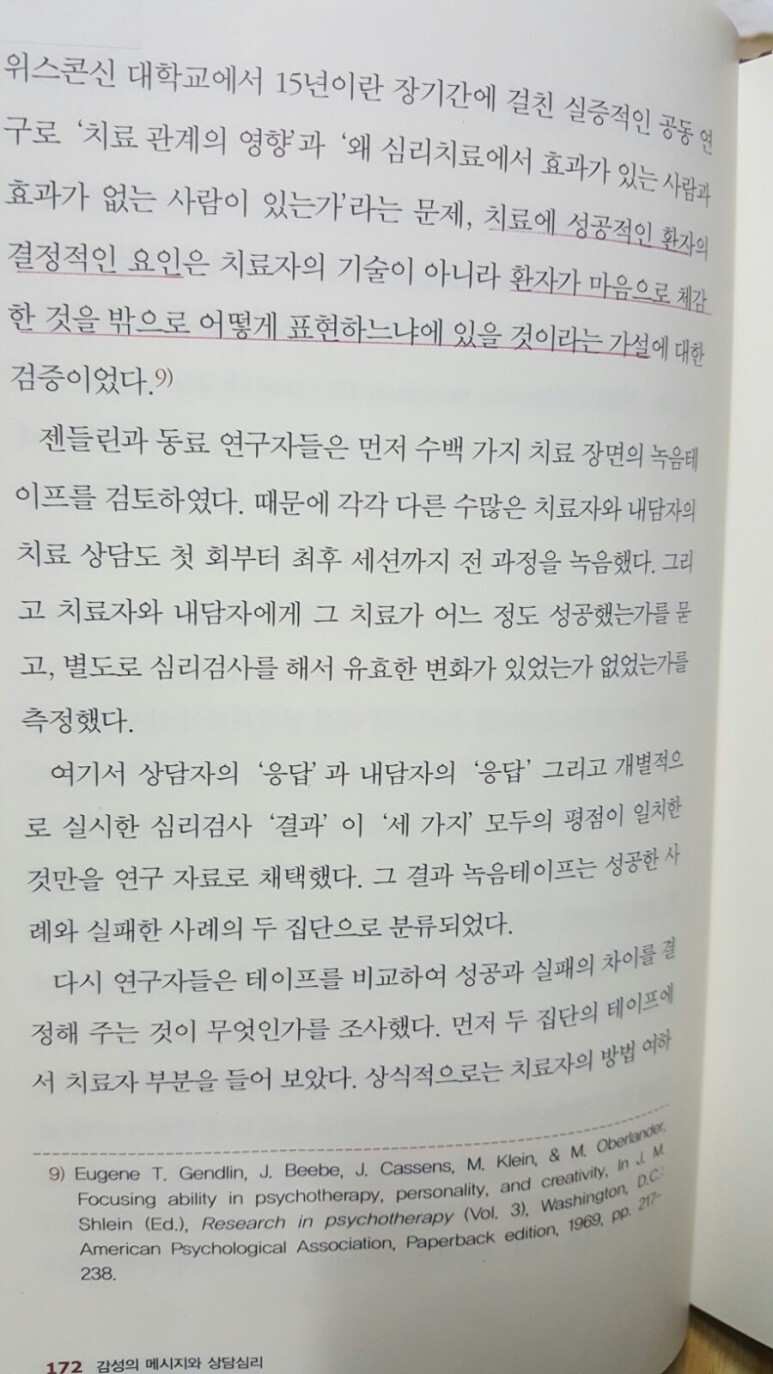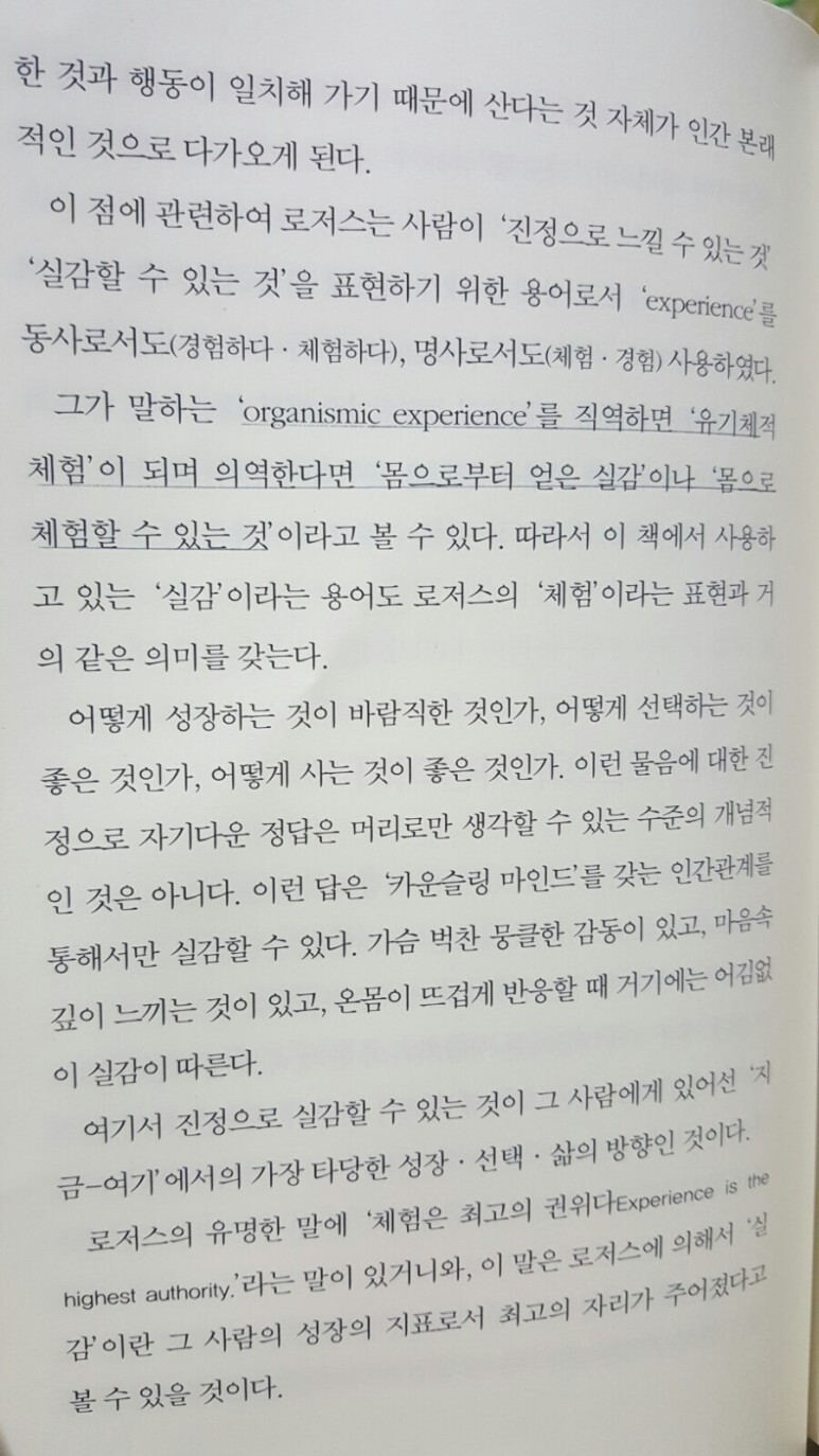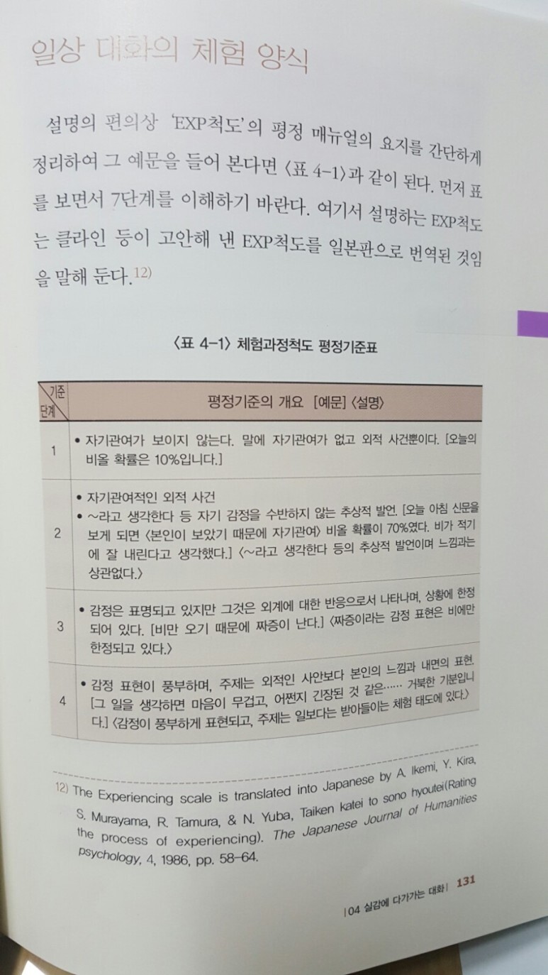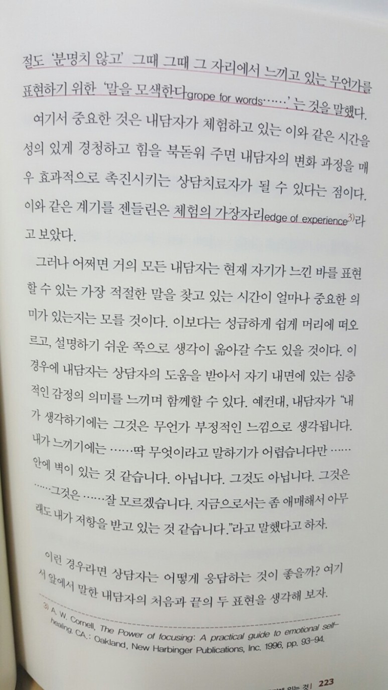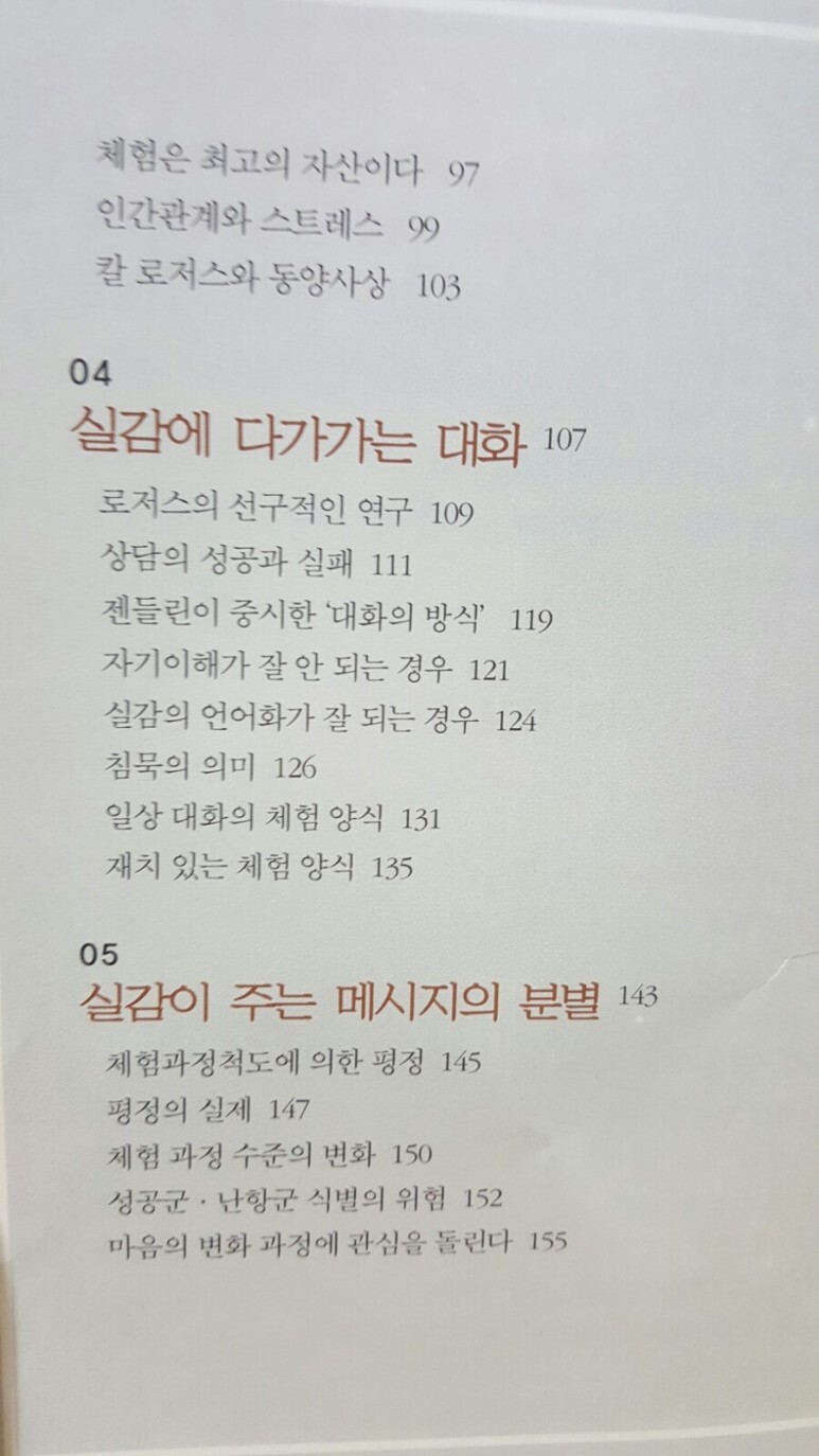 이론적인 부분이 없진 않지만, 일반인도 이해하기에 그리 어렵지 않으리라 봅니다. 여러 내용 중에 체험과정척도(EXP)에 관한 설명이 특히 좋았습니다. 인간중심상담이론의 칼 로저스, 포커싱 심리치료의 유진 젠들린에 관심있는 분들은 한 번 읽어보세요.