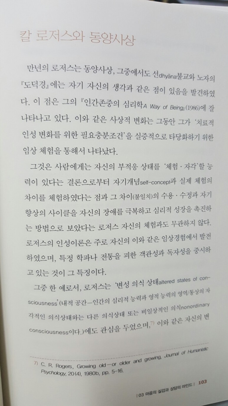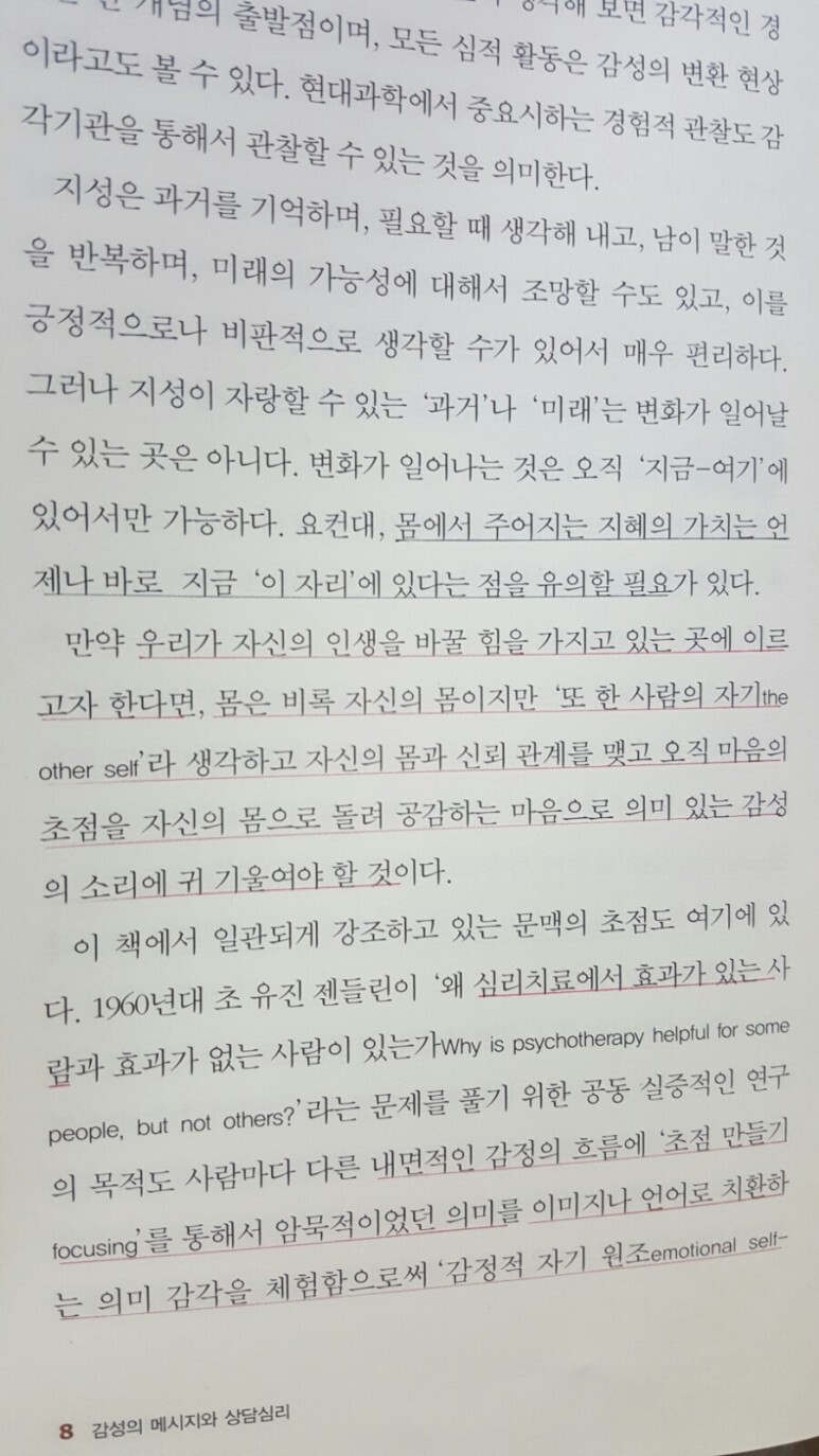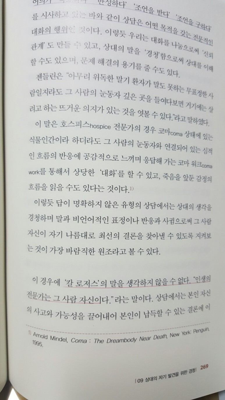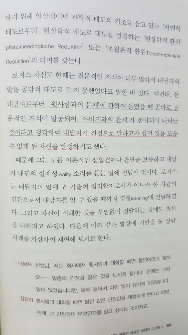 이론적인 부분이 없진 않지만, 일반인도 이해하기에 그리 어렵지 않으리라 봅니다. 여러 내용 중에 체험과정척도(EXP)에 관한 설명이 특히 좋았습니다. 인간중심상담이론의 칼 로저스, 포커싱 심리치료의 유진 젠들린에 관심있는 분들은 한 번 읽어보세요.