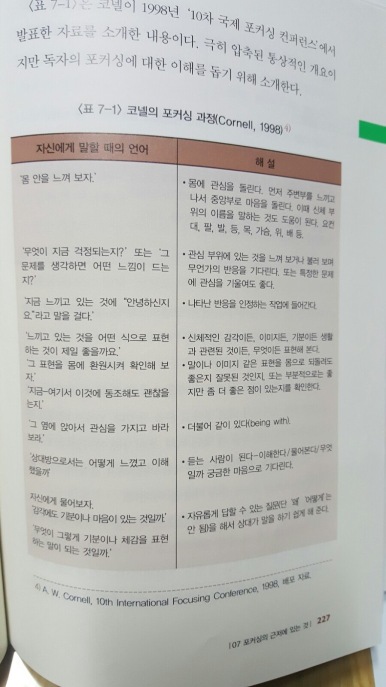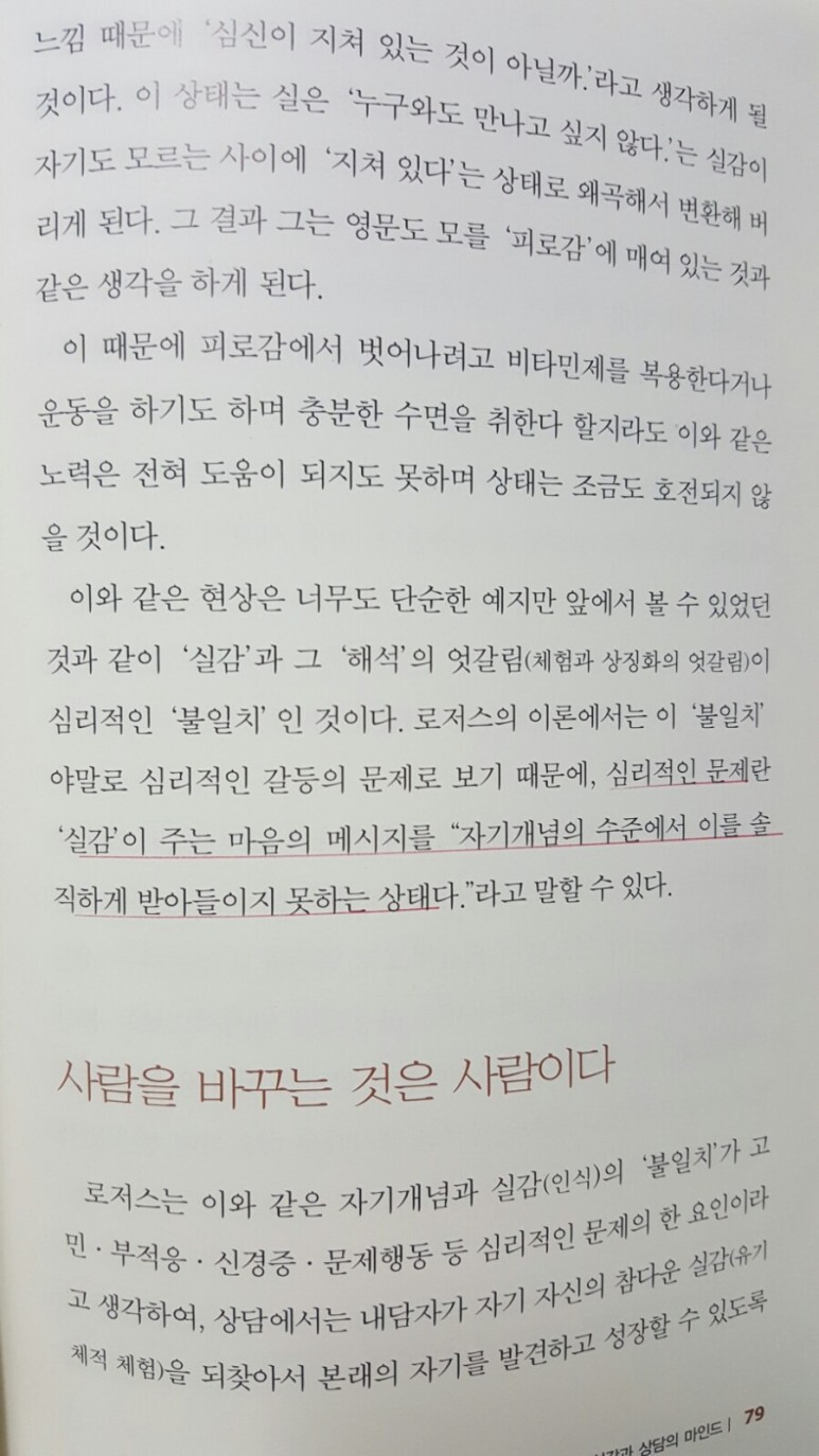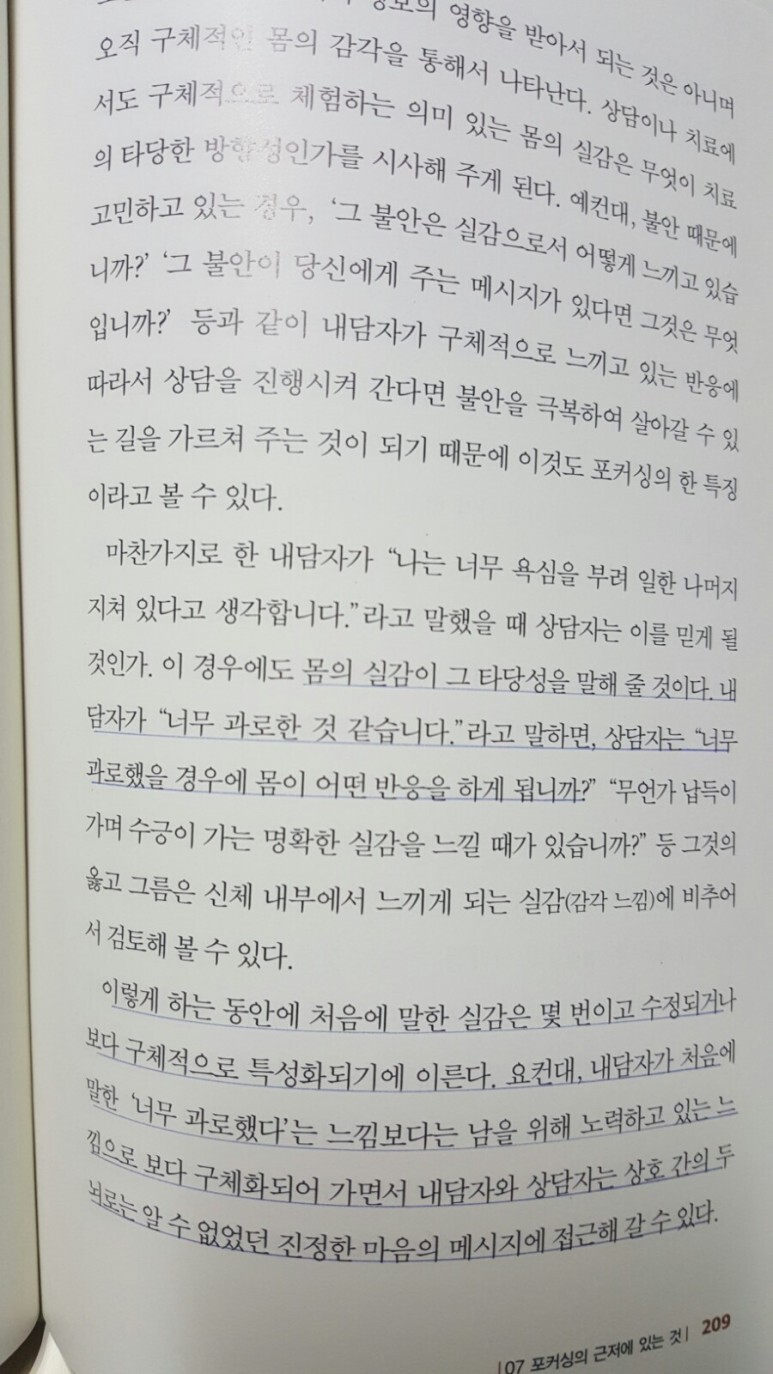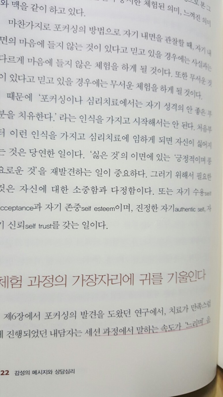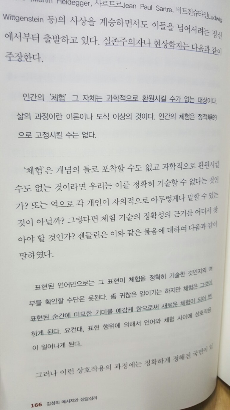 이론적인 부분이 없진 않지만, 일반인도 이해하기에 그리 어렵지 않으리라 봅니다. 여러 내용 중에 체험과정척도(EXP)에 관한 설명이 특히 좋았습니다. 인간중심상담이론의 칼 로저스, 포커싱 심리치료의 유진 젠들린에 관심있는 분들은 한 번 읽어보세요.