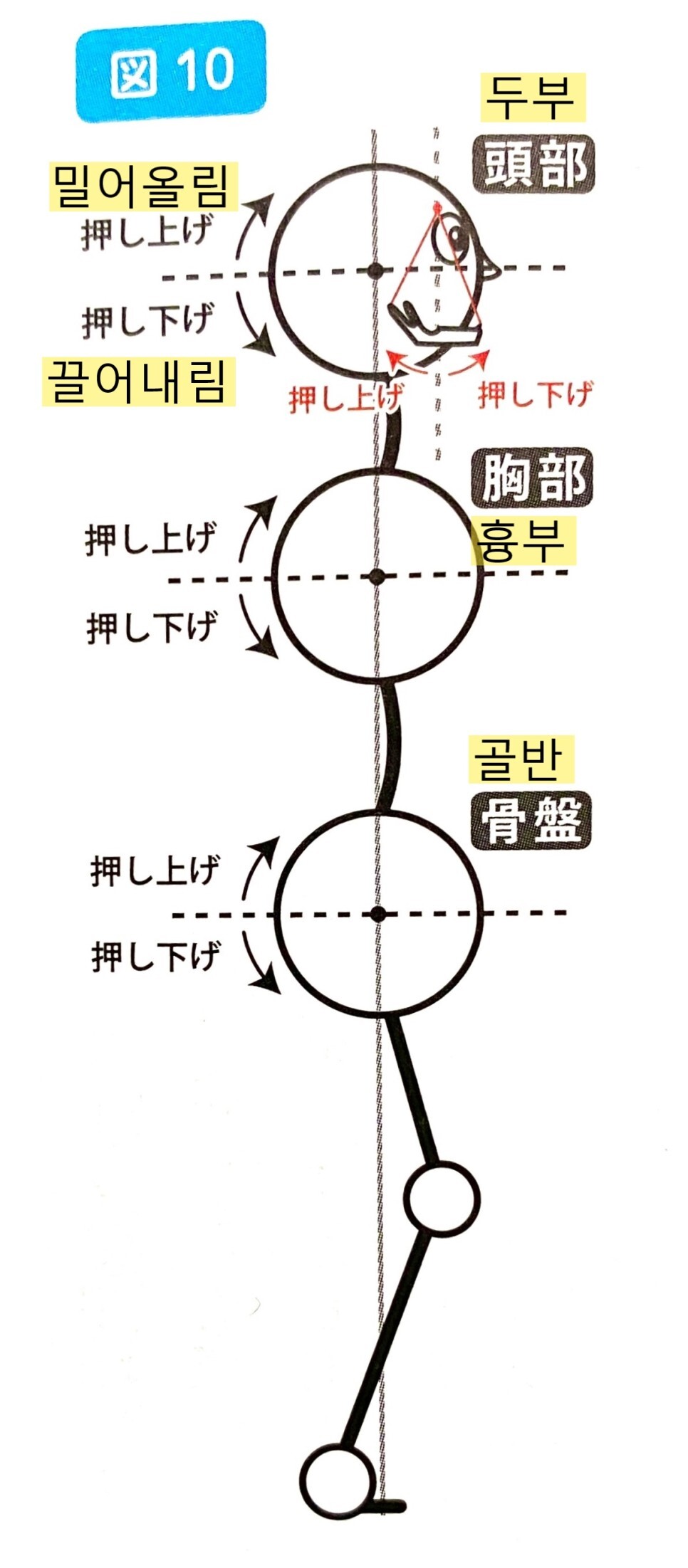 그래서 전신에 어떻게 힘이 전달되는지, 신체의 왜곡이 어디에 생기는지를 이해하기 위해 그림10과 같은 모델을 생각했습니다. 두부, 흉부, 골반, 그리고 아래턱의 4곳을 회전축으로 만들어 신체의 구조를 생각해 보았습니다.