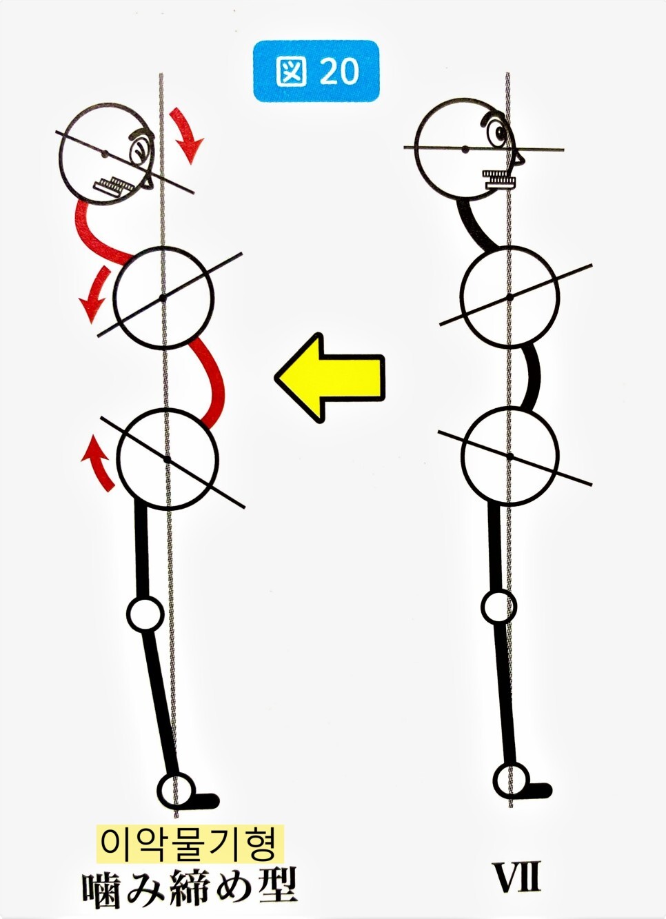 이악물기가 있는 사람의 자세는 Ⅶ형의 자세에 가깝다고 말할 수 있는데, Ⅶ형은 아래턱을 앞으로 내밀고 신체의 왜곡을 해소하려는데 비해, 이악물기형은 아래턱을 강하게 당겨, 두부와 같이 밀어올림회전하게 됩니다.(그림20)