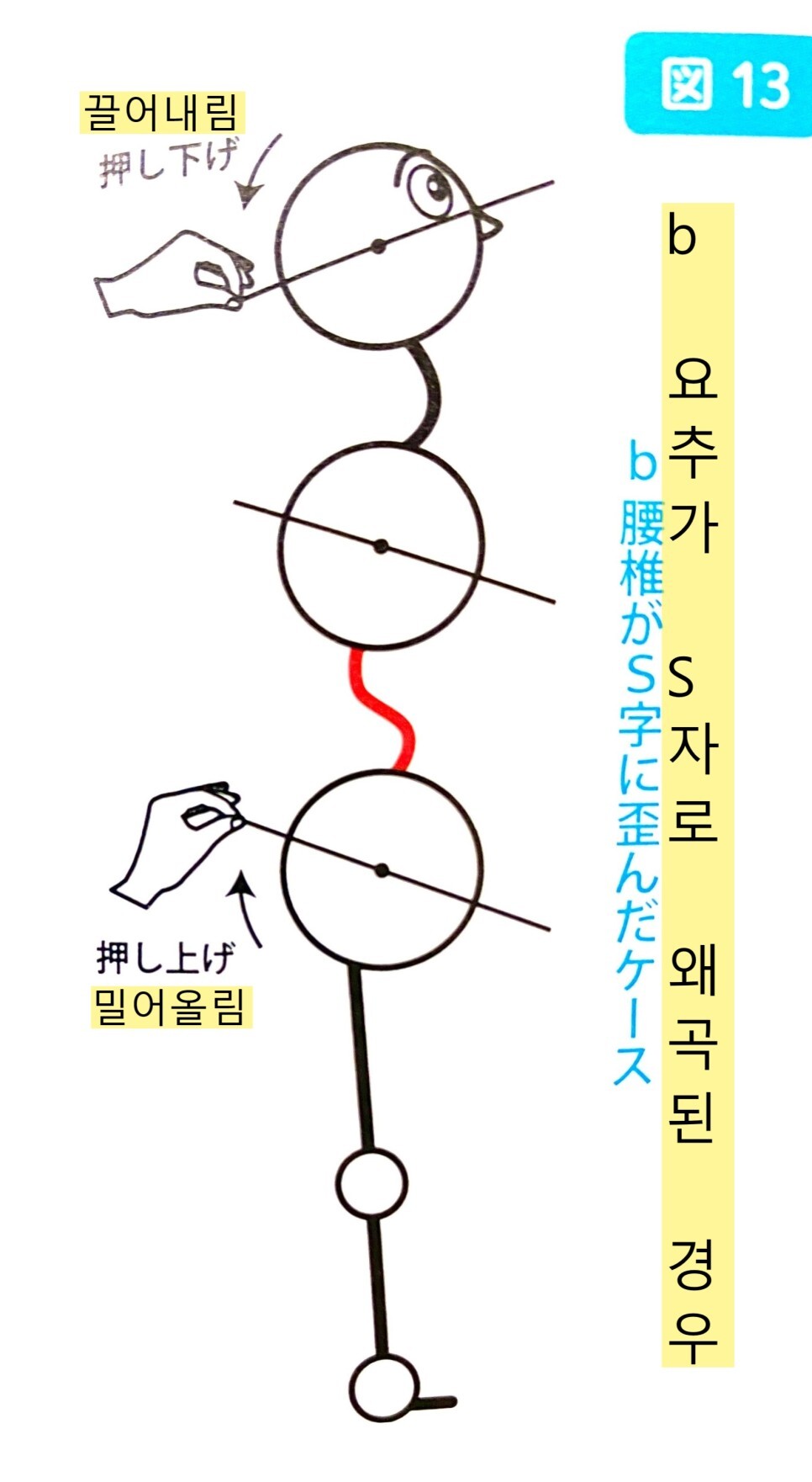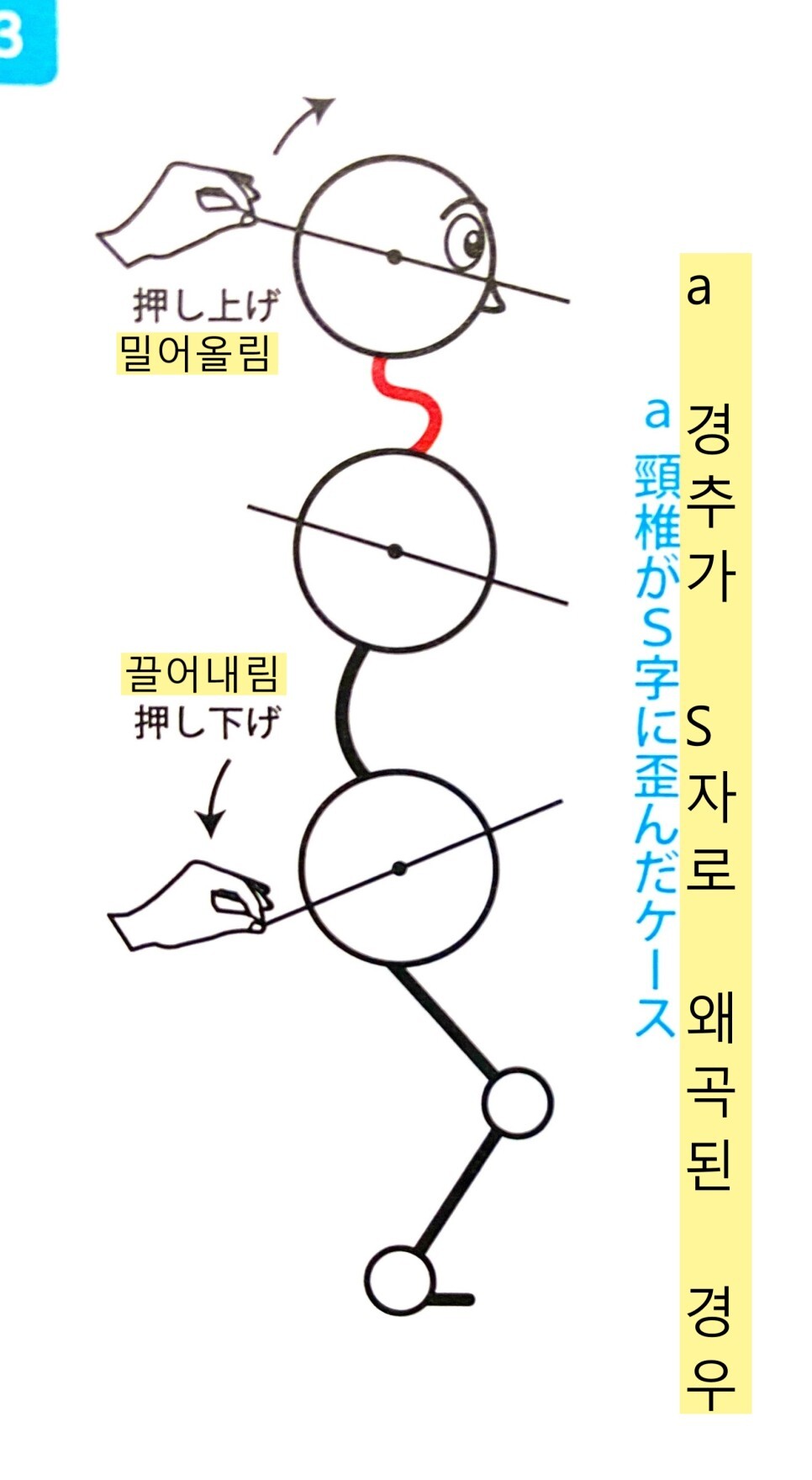 a : 두부를 밀어올리고, 골반을 끌어내립니다. 그러면 흉부는 밀어올려져 골반과 반대방향으로 스트레스 없이 회전하게 되는데, 두부와 같은 방향이 되어 사이에 있는 경추가 S자로 굽어집니다.