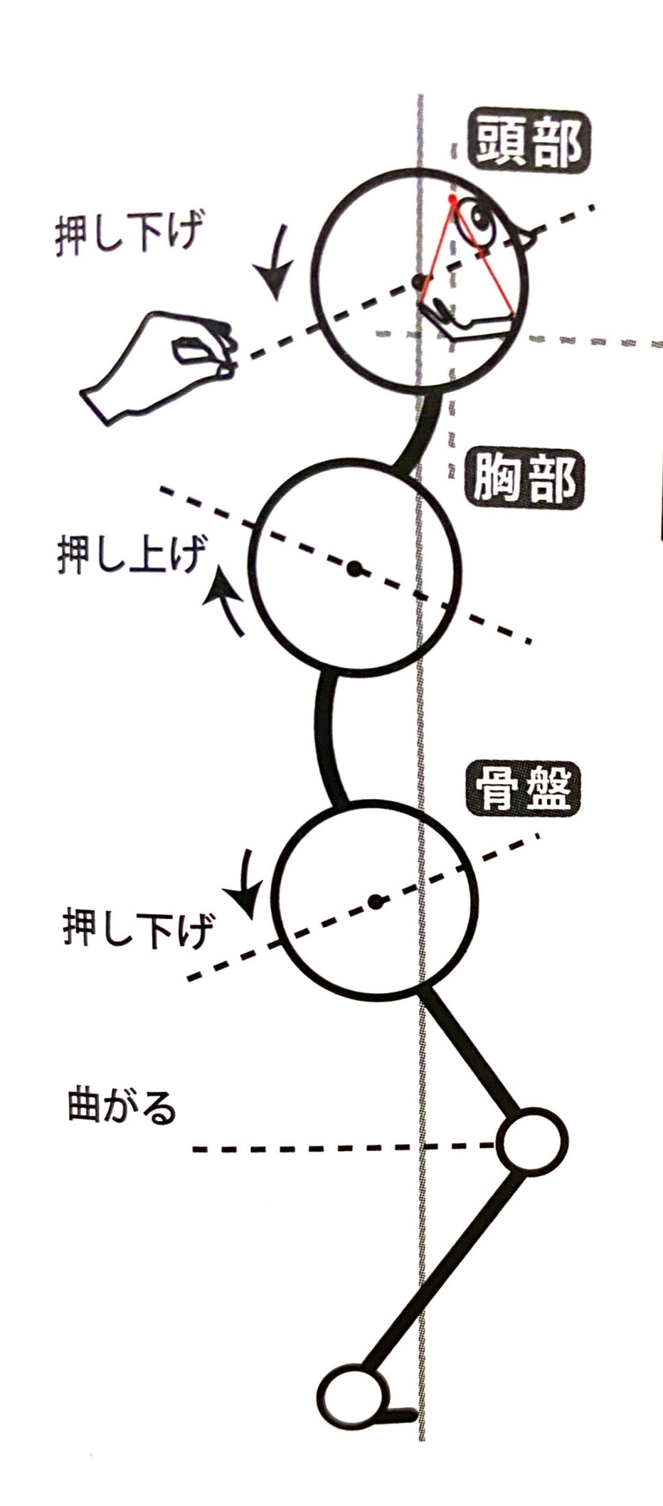 b : 두부를 끌어내리고, 골반을 밀어올림회전시켰습니다. 이 형에서는 흉부가 밀어올려져 머리의 회전과 연동합니다. 골반과는 같은 방향의 회전이 되어 사이에 있는 요추가 S자로 휘어져 버립니다.