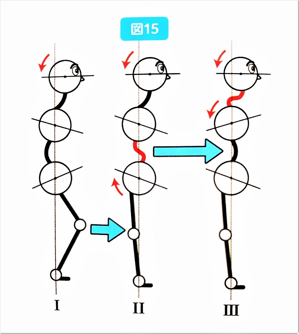 머리를 잡고 끌어내림회전시키면, 흉부는 연동하여 밀어올려지게 됩니다. 계속하여 골반은 끌어내려지게 되고, 무릎은 굽어집니다. 머리만이 아니라 흉부를 잡고 밀어올림회전시켜도, 골반을 잡고서 끌어내림회전시켜도 저 인형은 모두 연동하여 그림11과 같은 자세가 됩니다. 이 자세를 턱당기기형(Ⅰ형)으로 합니다.