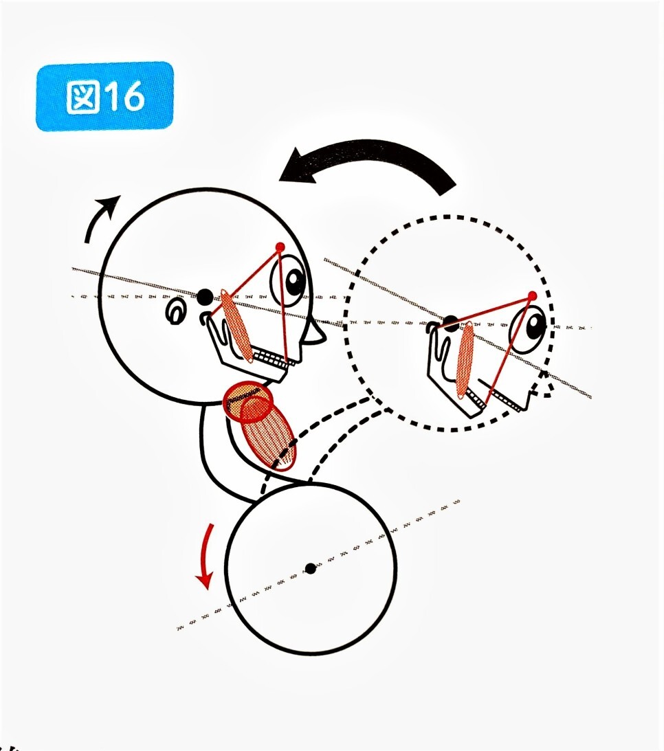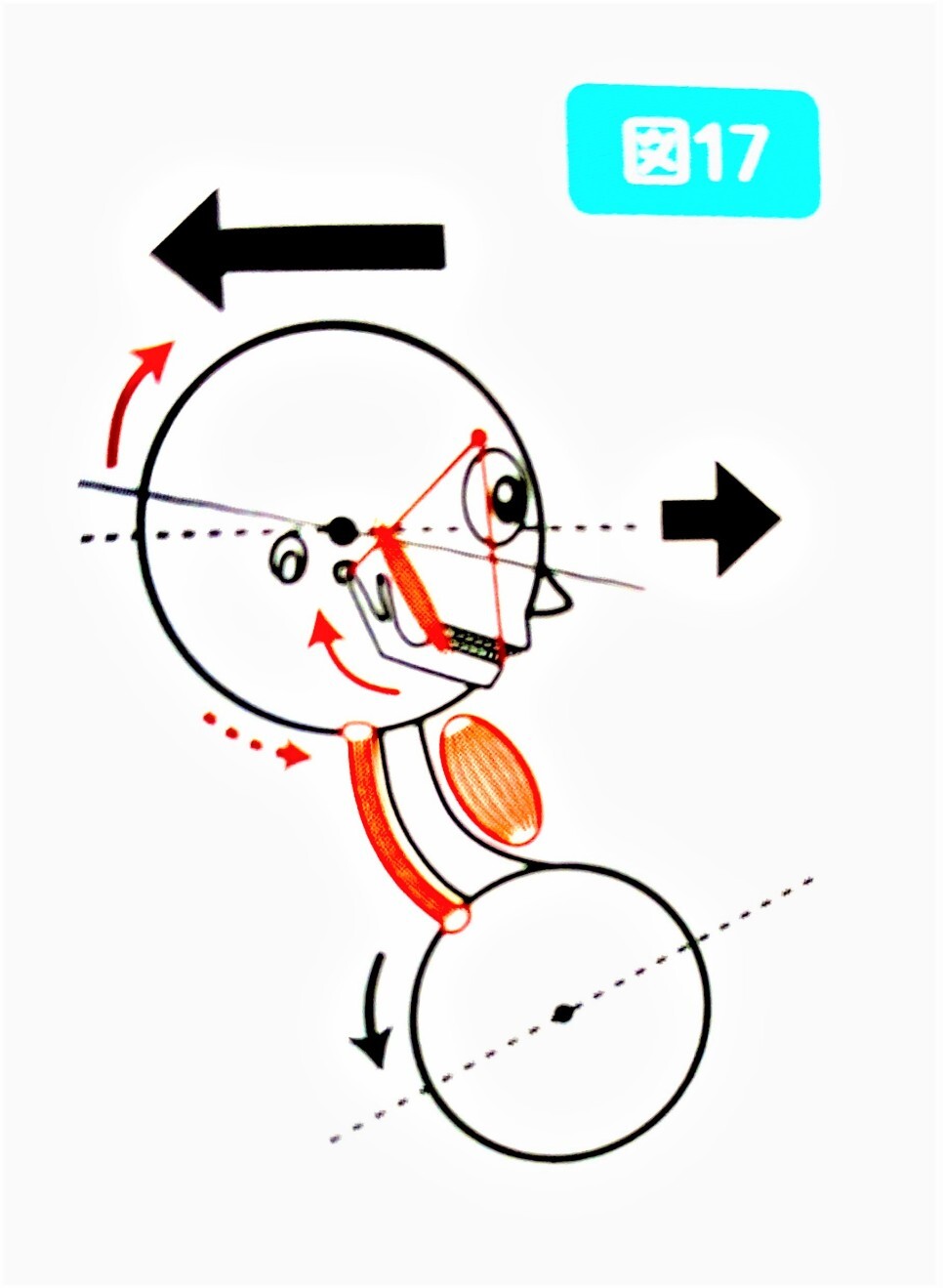 이들의 움직임을 정리하면 두부에는 흉부의 끌어내림회전이 촉진하는 두부의 밀어올림회전과, 뒤로 넘어지려고 할 때 작동하는 경반사에 의한 머리의 밀어올림회전 2가지가 크게 가해집니다. 그리고 아래턱에는 뒤로 넘어지지 않으려고 얼굴을 앞으로 내미는 밀어올림회전과, 얼굴이 아래를 향함으로써 전정기관에 의한 자세반사가 작동하여 얼굴을 들어 올리려고 하는( = 두부를 끌어내림회전) 밀어올림회전의 2가지가 크게 가해집니다.(그림17)