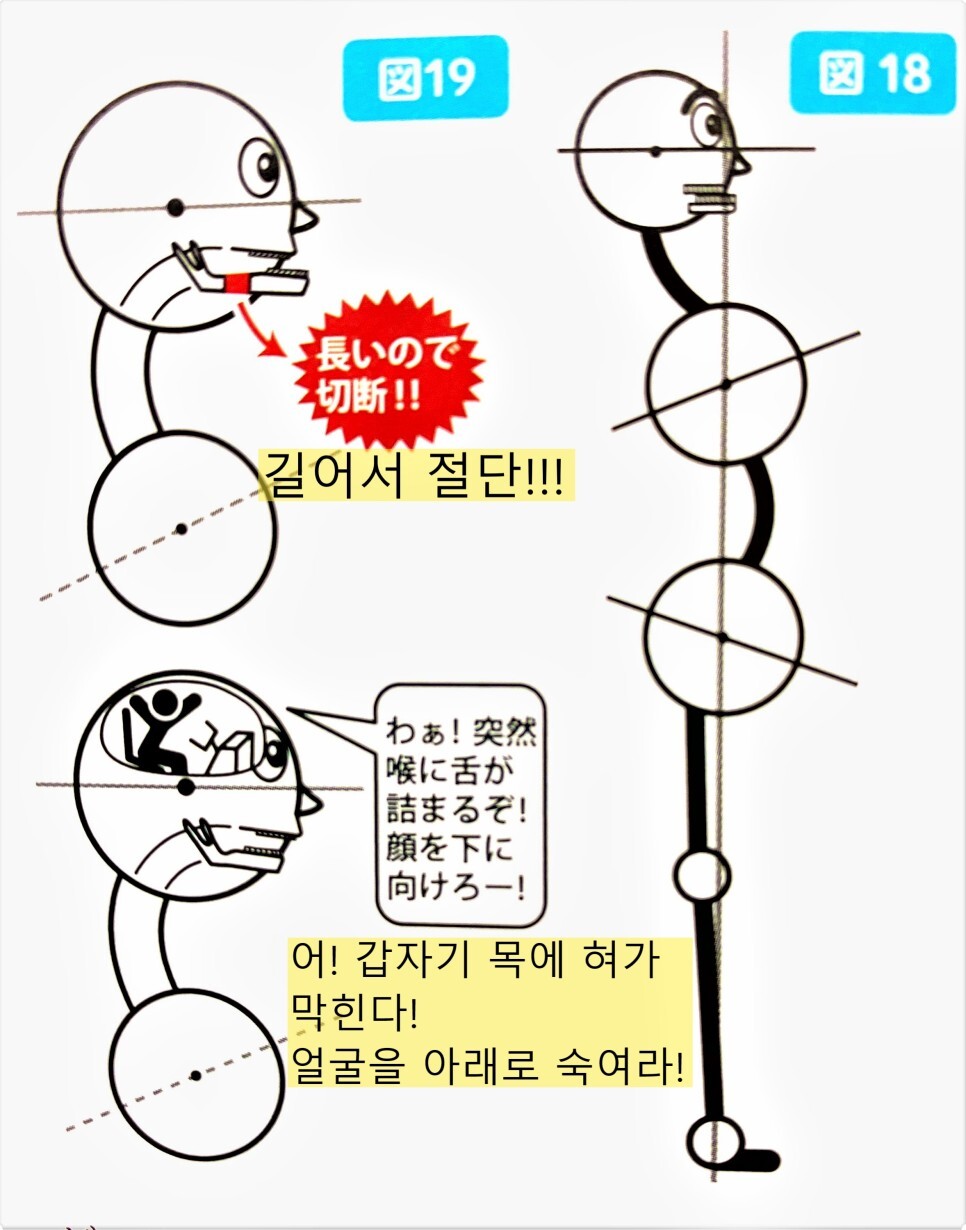 계속해서 그림8-7→그림8-8의 흐름입니다. 중간에 Ⅲ형에서 발병하는 흐름과 같아지는데, Ⅶ형에서 발병하는 경우는 인위적인 원인으로 발생하는 측면이 커서 증상이 심해질 수 있습니다. Ⅶ형은 두부가 밀어올림회전, 흉부는 끌어내림, 골반은 밀어올림회전합니다. 아래턱을 앞으로 내밀어(=끌어내림회전), 경추가 후만되어 기도를 확보합니다(그림18).