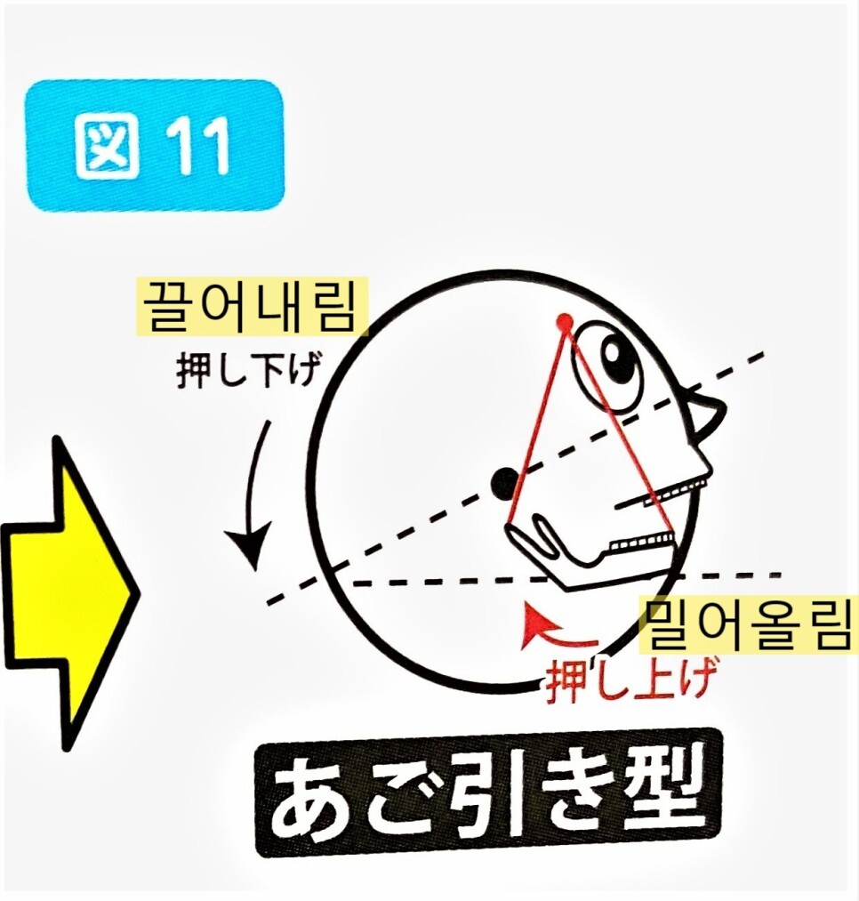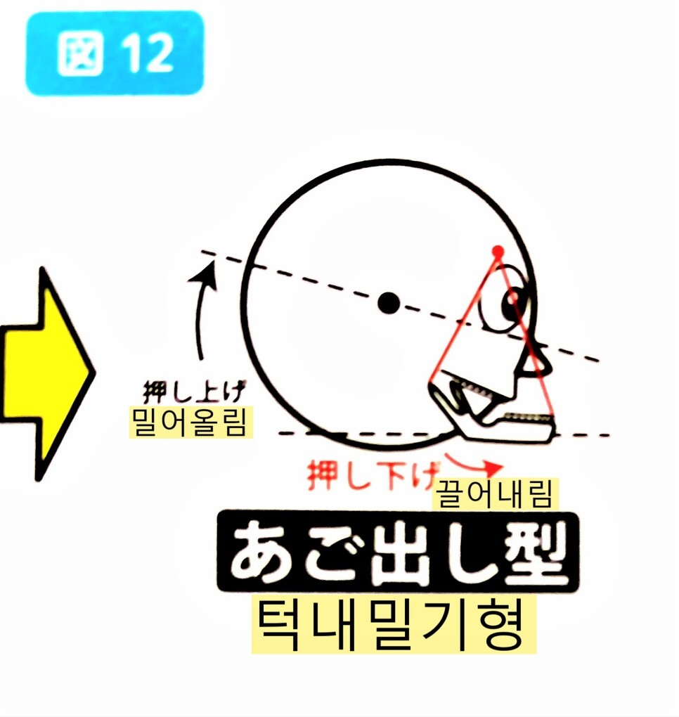 이러한 Ⅶ형에 두부에 강한 밀어올림회전이 더 걸리게 되면 이악물기형으로 이행됩니다. 예를 들면 Ⅶ형에서 안정된 사람이 주걱턱이 보기에 흉하다고 생각하여, 별 생각 없이 아래턱을 뒤로 밀어 넣으려고 하는 경우가 있습니다. 또 주걱턱 증상이 심한데, 왜 주걱턱이 되었는지 신체 기전을 이해하지 못한 채, 제멋대로 아랫니를 뽑거나, 아래턱의 뼈를 절단하여 길이을 짧게하는 수술이 행해지게 됩니다.(그림19)
