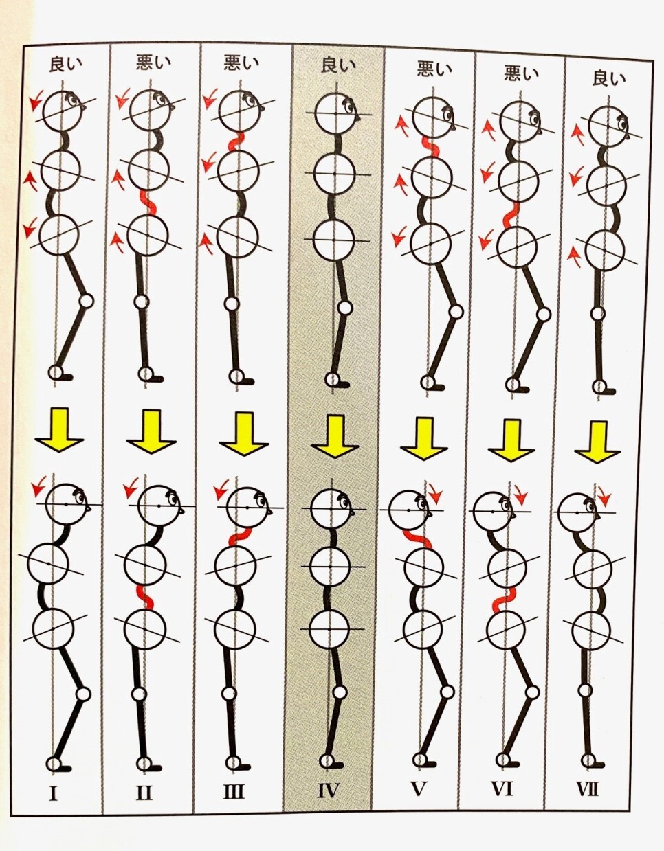 상단은 모델에서 유추하는 이론상의 유형입니다. 이웃하는 회전축이 반대방향인 Ⅰ형(턱당기기형), Ⅶ형(턱내밀기형), 모든 회전축이 평형상태를 유지하는 Ⅳ형은 왜곡이 없는 안정된 자세입니다. 좋은 자세란 [Ⅰ⇔ Ⅳ ⇔ Ⅶ]을 흔들흔들 왔다 갔다 하는 상태입니다.