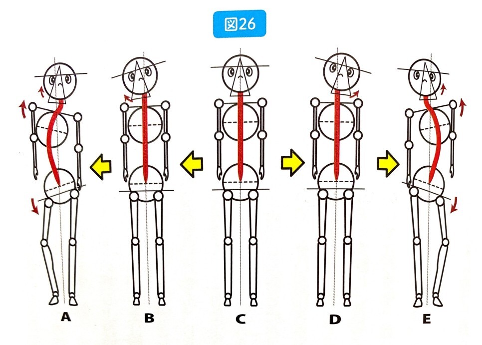 측면에서 본 자세로 설명드렸던 것과 마찬가지로, 정면에서 본 신체의 뒤틀림도 그림26의 B와 D와 같이 , 우선 머리가 귀울어지고, 그 다음 A와 E와 같이 어깨가 올라가는 순서로 일어나는 것은 아닙니다. 알기 쉽게 나누어 설명드리면, 이러한 움직임은 동시에 일어납니다. 어떤 자세가 되는가 실제로 자신의 몸으로 체감해 보세요.