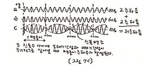 [그림 7C]에서 a열은 주파수가 매초 50사이클이고, b열은 매초 60사이클이다. 앞에서 두 파동을 겹쳤을 때처렴 이 두 개의 파동을 겹치면 흥미 있는 현상이 일어남을 알 수 있다. c열은 두 파동 이 겹쳐졌을 때 나타나는 결과를 보여준다.